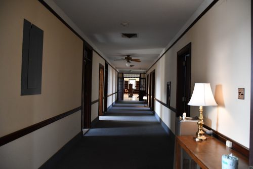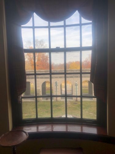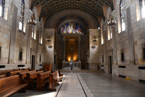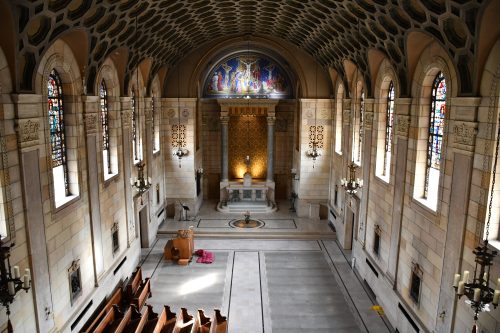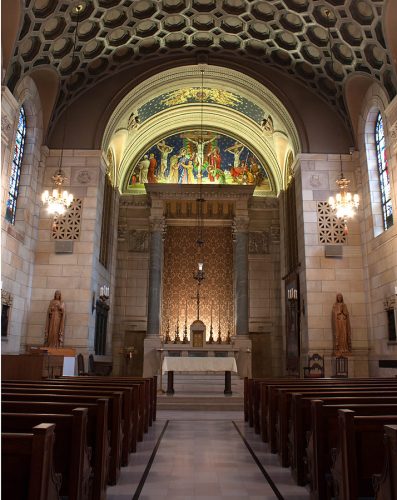 Built in the English Renaissance style; the Noviate Building contains many ornate features including carved oak, marble, and coffered ceilings with glasss mosaic designs fabricated by Puhl & Wagner in Berlin, Germany, and installed by Ravenna Mosaics.